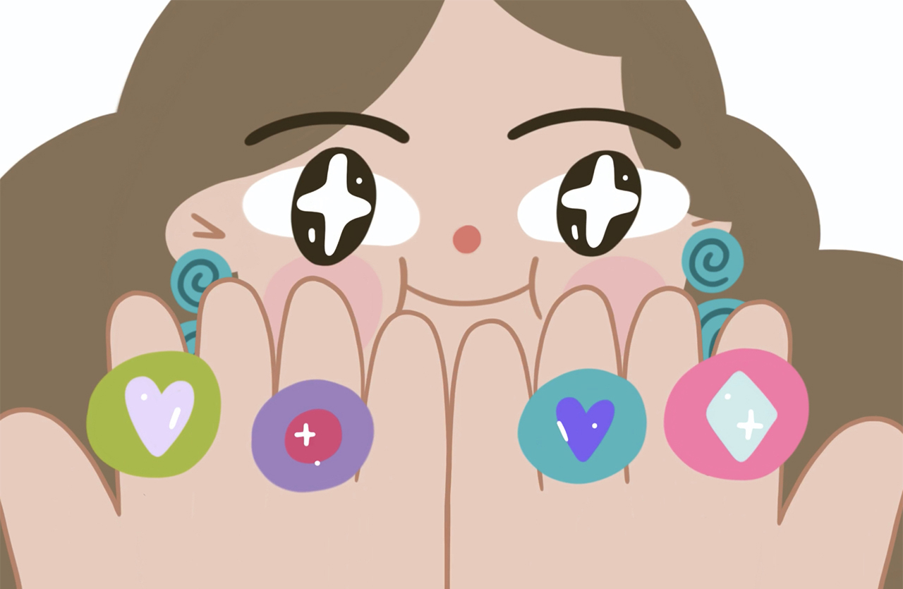 Frame animation of a cute girl trying on sparkly rings and earrings.
